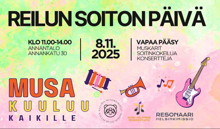 Maksuton koko perheen musiikkitapahtuma Reilun Soiton Päivä järjestetään tänä syksynä Annantalolla (Annankatu 30).